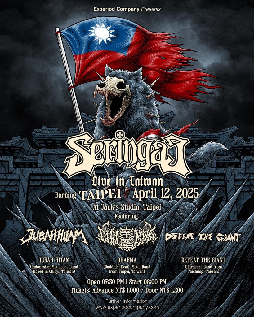 Inspired by a track entitled “Membakar Jakarta,,” which translates to “Burning Jakarta,” the second stop of Seringai: Live in Taiwan is named Burning Taipei, as both Jakarta and Taipei are the capitals of Indonesia and Taiwan, respectively. The second show will be in Taipei City on Saturday, April 12, 2025. Burning Taipei will feature: Dharma, a Buddhist death metal band from Taipei, Taiwan; Defeat The Giant, a hardcore band from Taichung, Taiwan; and Jubah Hitam, an Indonesian metalcore band based in Chiayi, Taiwan. This show appears to be a collaboration featuring various genres from different cities and countries in the capital, Taipei.